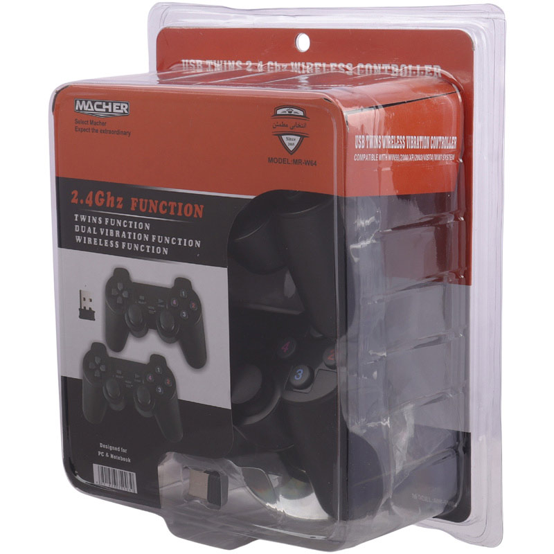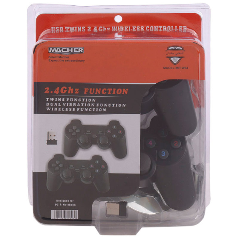 دسته بازی وایرلس مچر مدل MR-W64 بسته دو عددیتامین انرژی توسط دو عدد باتری سایز AAA، دارای استاندارد ایمنی و سلامت محصول CEنحوه ی برقراری ارتباط با لپ تاپ و سیستم به صورت بی سیم توسط دانگل USB همراهبدنه ساخته شده از پلاستیک مقاوم، طراحی شده به صورت ارگونومیکفرکانس بی سیم 2.4 گیگاهرتز، دارای دو شوکر و 15 عدد کلید فیزیکیپشتیبانی از کنترل دیجیتال و آنالوگ با دکمه Mode